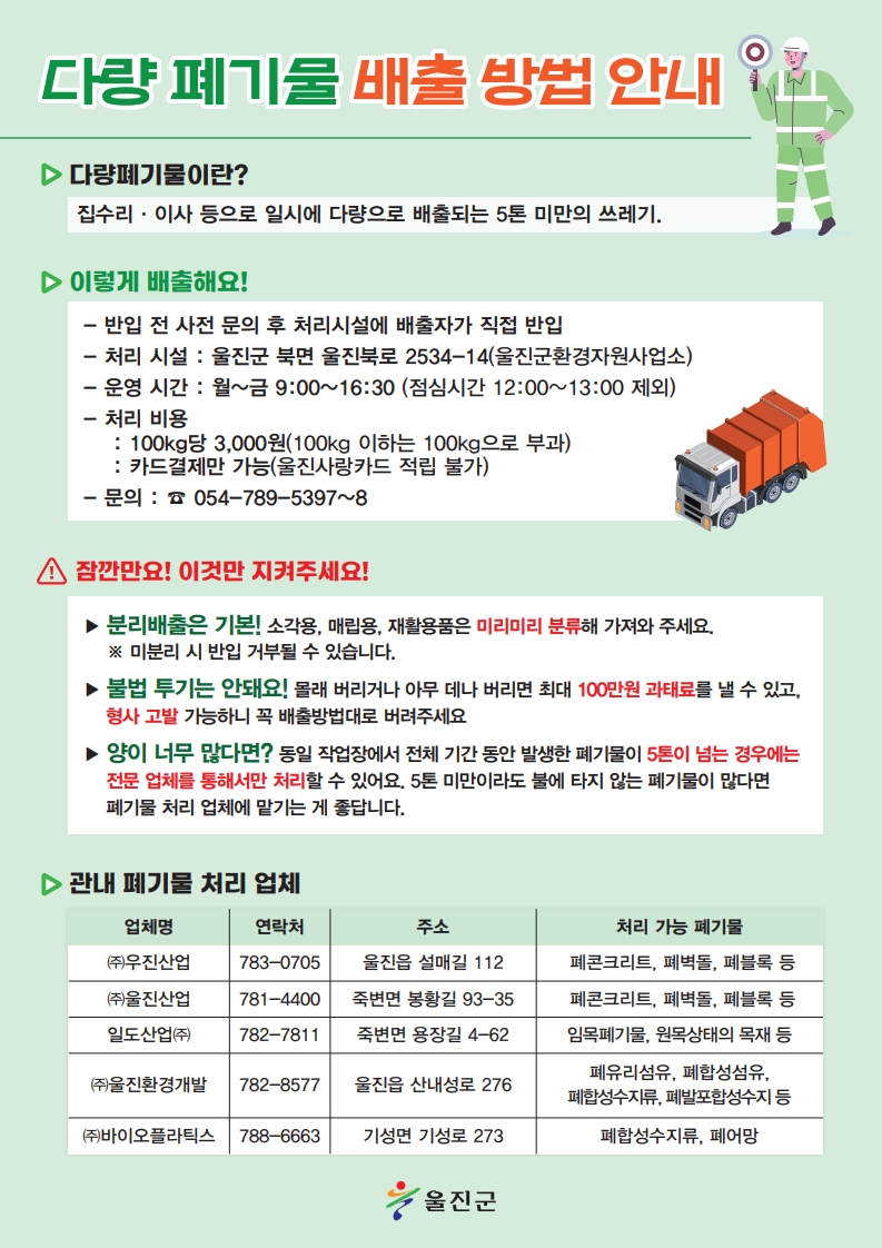 ¾Æ¿ï·¯, ÀÏ·ÃÀÇ °ø»ç ¶Ç´Â ÀÛ¾÷ Áß ¹ß»ýÇÏ´Â 5Åæ ÀÌ»óÀÇ Æó±â¹°Àº ¹Ýµå½Ã Æó±â¹° 󸮾÷ü¿¡ À§Å¹Ã³¸®ÇÏ¿©¾ß Çϸç, 5Åæ ¹Ì¸¸ÀÌ¶óµµ ´Ù·®ÀÇ ºÒ¿¬¼ºÆó±â¹°À» ¹èÃ⠽à Æó±â¹° ó¸® ¾÷ü¿¡ À§Å¹ 󸮰¡ °¡´ÉÇÏ´Ù. ¶ÇÇÑ, ºÒ¹ý Åõ±â³ª ÁöÁ¤µÈ Àå¼Ò ¿Ü ¹èÃ⠽ÿ¡´Â ÃÖ´ë 100¸¸ ¿øÀÇ °úÅÂ·á ¶Ç´Â Çü»ç °í¹ß µîÀÇ Á¶Ä¡°¡ ÀÌ·ç¾îÁú ¼ö ÀÖÀ¸¸ç ÀÚ¼¼ÇÑ »çÇ×Àº ¿ïÁø±º ȯ°æÀÚ¿ø»ç¾÷¼Ò(¢Ï054-789-5397~8)·Î ¹®ÀÇÇÏ¸é ¾È³»¹ÞÀ» ¼ö ÀÖ´Ù.