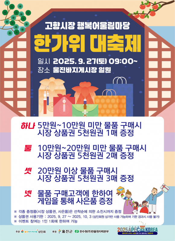 À̹ø Çà»ç´Â ¿ïÁø¹ÙÁö°Ô½ÃÀå¿¡¼ ¿¸®¸ç, Áö³ 9¿ù 27ÀÏ¿¡´Â¡®2025³â °íÇâ½ÃÀå Çູ¾î¿ï¸²¸¶´ç¡¯À» ÁøÇàµÆ´Ù. Çà»ç¿¡¼´Â ¼Òºñ ±Ý¾×¿¡ µû¶ó ÀüÅë½ÃÀå »óǰ±ÇÀ» µ¹·ÁÁÖ´Â ÆäÀ̹é À̺¥Æ®°¡ ¸¶·ÃµÅ 5¸¸ ¿ø ÀÌ»ó 10¸¸ ¿ø ¹Ì¸¸ ±¸¸Å °í°´¿¡°Ô´Â 5õ ¿ø »óǰ±Ç 1¸Å, 10¸¸ ¿ø ÀÌ»ó 20¸¸ ¿ø ¹Ì¸¸Àº 2¸Å, 20¸¸ ¿ø ÀÌ»óÀº 3¸Å°¡ Áö±ÞµÆ´Ù. ÀÌ¿Í ÇÔ²² °æÇ° ´ÙÆ®°ÔÀÓ µî üÇè Çà»çµµ ÁغñµÅ ¹æ¹®°´µé¿¡°Ô ´Ù¾çÇÑ »çÀºÇ°ÀÌ Á¦°øµÆ´Ù.