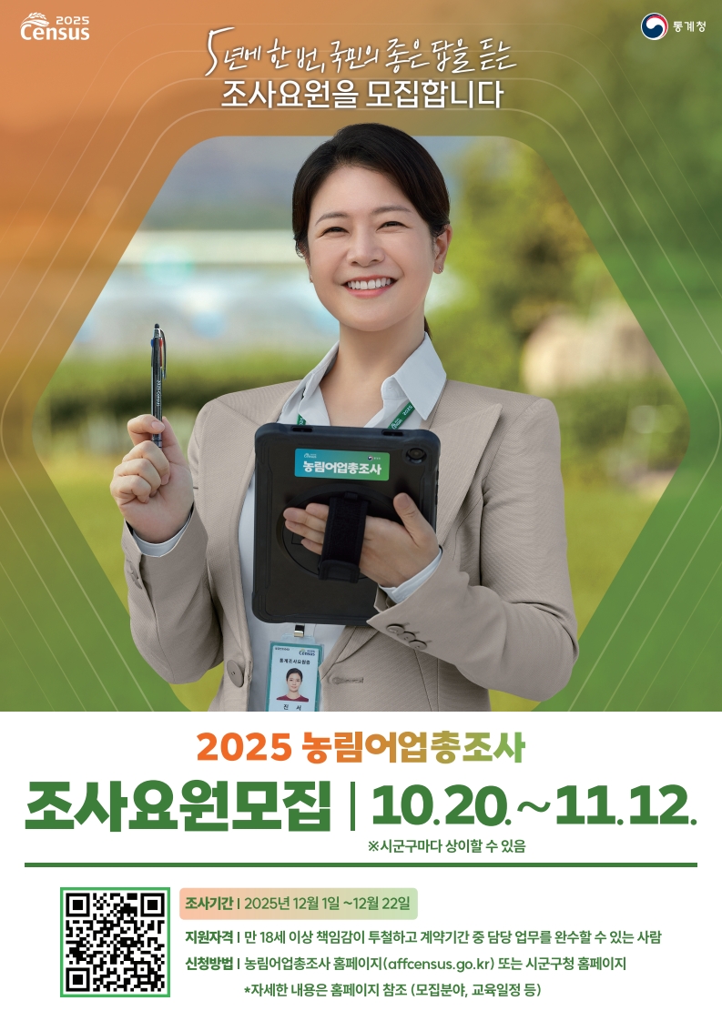 ¸ðÁý ÀοøÀº ÃÑ 153¸íÀ¸·Î ÇöÀå ¹æ¹® Á¶»ç¿Í ÀÀ´ä ÀÚ·á °ËÁõ µîÀ» ¼öÇàÇÒ ¿¹Á¤ÀÌ´Ù. ¸ðÁý ´ë»óÀº ¸¸ 18¼¼ ÀÌ»óÀ¸·Î, ÄÄÇ»ÅÍ(¶Ç´Â ÅÂºí¸´PC) Ȱ¿ëÀÌ °¡´ÉÇϰí Ã¥ÀÓ°¨ ÀÖ°Ô Á¶»ç ¾÷¹«¸¦ ¼öÇàÇÒ ¼ö ÀÖ´Â »ç¶÷ÀÌ¸é ´©±¸³ª Áö¿øÀÌ °¡´ÉÇÏ´Ù. ¸ðÁý ±â°£Àº 10¿ù 20ÀϺÎÅÍ 11¿ù 12ÀϱîÁöÀ̸ç, ±èõ½Ãû Á¤º¸±âȹ°ú ¹× À¾¸éµ¿ ÇàÁ¤º¹Áö¼¾ÅÍ ¹æ¹® Á¢¼ö ¶Ç´Â ³ó¸²¾î¾÷ÃÑÁ¶»ç ȨÆäÀÌÁö(www.affcensus.go.kr)¿¡¼ ¿Â¶óÀÎ Á¢¼ö°¡ °¡´ÉÇÏ´Ù.