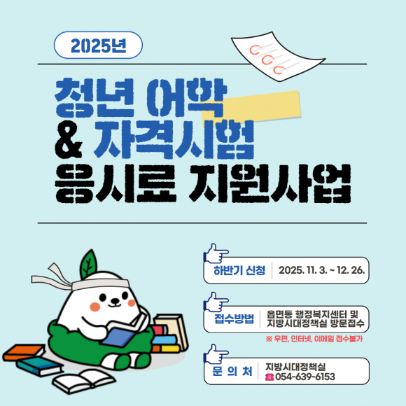 [°æºÏÆ÷Ä¿½º½Å¹®=ÀÌ»óÈñ±âÀÚ] ¿µÁֽô 11¿ù 3ÀϺÎÅÍ 12¿ù 26ÀϱîÁö "û³â ¾îÇÐ ¹× ÀڰݽÃÇè ÀÀ½Ã·á Áö¿ø»ç¾÷" ÇϹݱâ Á¢¼ö¸¦ ½ÃÀÛÇÑ´Ù.