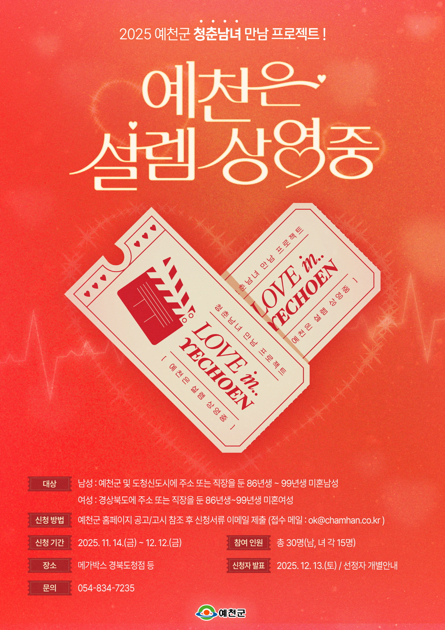 ¸ðÁýÀοøÀº ÃÑ 30¸í(³²³à °¢ 15¸í)À̸ç, Âü°¡ ´ë»óÀº ¿¹Ãµ±º ¶Ç´Â µµÃ»½Åµµ½Ã¿¡ ÁÖ¼Ò³ª Á÷ÀåÀ» µÐ 1986³â»ýºÎÅÍ 1999³â»ý±îÁöÀÇ ¹ÌÈ¥³²¼º°ú, °æºÏÁö¿ª¿¡ ÁÖ¼Ò ¶Ç´Â Á÷ÀåÀ» µÐ 1986³â»ýºÎÅÍ 1999³â»ý±îÁöÀÇ ¹ÌÈ¥¿©¼ºÀÌ´Ù.