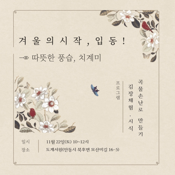 [°æºÏÆ÷Ä¿½º½Å¹®=ÀÌ»óÈñ±âÀÚ] ¹®È°ø°£ µµ°è(´ëÇ¥ À̵¿ÁÖ)´Â ¿À´Â 11¿ù 22ÀÏ(Åä), °Ü¿ïÀ» ¸Â¾Æ ¾Èµ¿½Ã ºÏÈÄ¸é µµ°è¼¿ø¿¡¼ ¡¸µµ°èÀÇ ¿µÎ¸¶´ç ¼¼½ÃÀ̾߱⡹ ÇÁ·Î±×·¥ÀÇ ÀÏȯÀ¸·Î "°Ü¿ïÀÇ ½ÃÀÛ, ÀÔµ¿! - µû¶æÇÑ Ç³½À, Ä¡°è¹Ì" üÇèÇà»ç¸¦ °³ÃÖÇÑ´Ù.