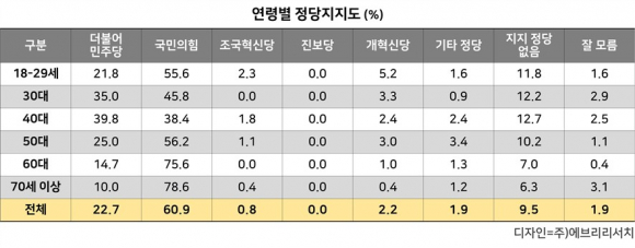 ¹ÎÁÖ´çÀº ÀüÅë ÁöÁö ¿¬·ÉÃþÀÎ 40´ë¿¡¼ 39.8%·Î ¿ÀÂ÷¹üÀ§ ³»Áö¸¸, ±¹¹ÎÀÇÈû 38.4%ÀÇ ÁöÁöÀ²º¸´Ù ¾Õ¼´Â °ÍÀ¸·Î Á¶»çµÇ¾ú´Ù.