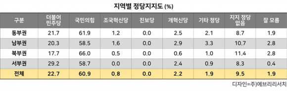 Áö¿ªº° °á°ú, ±¹¹ÎÀÇÈûÀº ¾Èµ¿À» Áß½ÉÀ¸·Î ÇÑ ºÏºÎ±Ç¿¡¼ 66.0% ÁöÁöÀ²·Î °¡Àå ³ôÀº ÁöÁö¸¦ ¹Þ¾ÒÀ¸¸ç, Æ÷Ç×À» Áß½ÉÀ¸·Î ÇÑ µ¿ºÎ±Ç 61.9%, ±¸¹Ì¸¦ Áß½ÉÀ¸·Î ÇÑ ¼ºÎ±ÇÀÌ 58.7%, °æ»êÀ» Áß½ÉÀ¸·Î ÇÑ ³²ºÎ±ÇÀÌ 58.5% ÁöÁöÀ²ÀÇ Á¶»ç °á°ú´Ù.