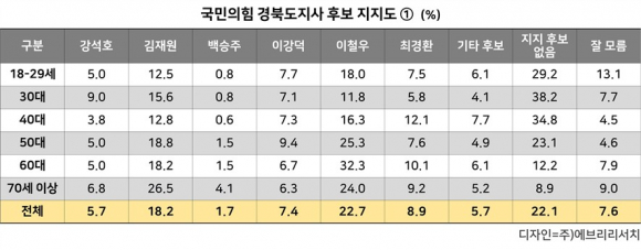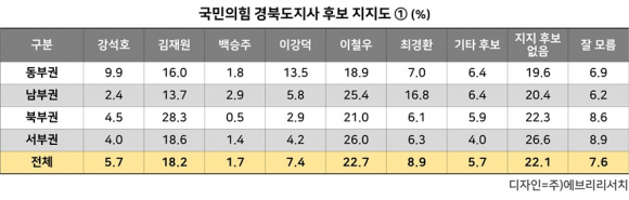 ÀÌö¿ì Çö °æºÏµµÁö»ç¸¦ Æ÷ÇÔÇÑ 6¸íÀ» ´ë»óÀ¸·Î ÇÑ ¿©·ÐÁ¶»ç °á°ú ±¹¹ÎÀÇÈû °æºÏµµÁö»ç Èĺ¸ ÁöÁöµµ´Â ÀÌö¿ì 22.7%, ±èÀç¿ø 18.2%, ÃÖ°æÈ¯ 8.9%, À̰´ö 7.4%, °¼®È£ 5.7%, ¹é½ÂÁÖ 1.7% ¼øÀ¸·Î ³ªÅ¸³µÀ¸¸ç, ±âŸ Èĺ¸ 5.7%, ÁöÁö Èĺ¸ ¾øÀ½ 22.1%, Àß ¸ð¸£°Ú´Ù 7.6%·Î Á¶»çµÇ¾ú´Ù. (ÀÌÇÏ ¿©·ÐÁ¶»ç ´ë»óÀº ¼º¸íÀ¸·Î)