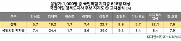 ÀÀ´äÀÚ 1,000¸í Áß ±¹¹ÎÀÇÈû ÁöÁöÃþ 618¸íÀ» ´ë»óÀ¸·Î ±³Â÷ºÐ¼®ÇÑ °á°ú, ±èÀç¿øÀº 32.8%·Î Àüü ÁöÁöÀ²º¸´Ù ³ôÀº ÁöÁö¸¦ ¹ÞÀº °¡¿îµ¥, Àüü ÁöÁöµµ¿Í ±¹¹ÎÀÇÈû ÁöÁöÃþÀÇ ÁöÁöµµ¿¡¼ ¼øÀ§ º¯µ¿Àº ¾ø¾ú´Ù. ±×·¯³ª Áö³ 22´ë ÃѼ±¿¡¼ °æ»ê½Ã ¼±°Å±¸¿¡¼ ±¹¹ÎÀÇÈûÀ» Å»´çÇØ ¹«¼Ò¼Ó Ã⸶Çß´ø ÃÖ°æÈ¯ÀÌ 12.5%¸¦ ¹Þ¾Æ ÁÖ¸ñµÈ´Ù.