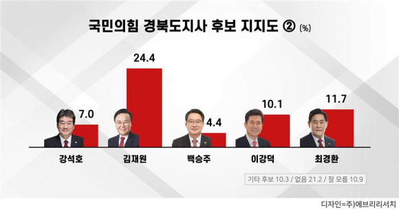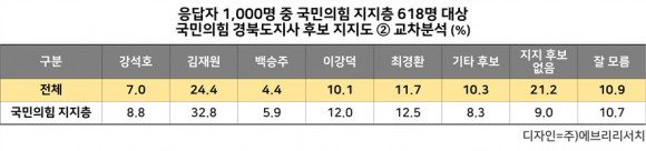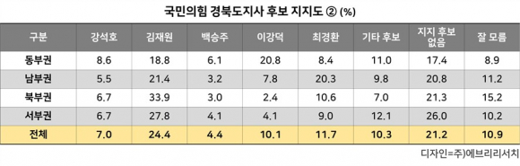 ÀÌö¿ì È常¦ Á¦¿ÜÇÑ ±¹¹ÎÀÇÈû °æºÏµµÁö»ç Ã⸶¿¹»óÀÚµéÀÇ ÁöÁöµµ´Â ±èÀç¿ø 24.4%, ÃÖ°æÈ¯ 11.7%, À̰´ö 10.1%, °¼®È£ 7.0%, ¹é½ÂÁÖ 4.4% ¼øÀ¸·Î ³ªÅ¸³µÀ¸¸ç, ±âŸ Èĺ¸ 10.3%, ÁöÁö Èĺ¸ ¾øÀ½ 21.2%, Àß ¸ð¸£°Ú´Ù 10.9%·Î Á¶»çµÇ¾ú´Ù.