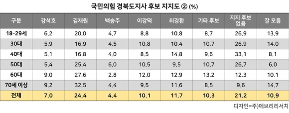 ±¹¹ÎÀÇÈû °æºÏµµÁö»ç Èĺ¸ ÁöÁöµµ ¿¬·Éº° Á¶»ç °á°ú, ÀÌö¿ì´Â 60´ë, 50´ë, 18¼¼ ÀÌ»ó 20´ë, 40´ë¿¡¼ Ÿ Èĺ¸ ´ëºñ ³ôÀº ÁöÁö¸¦ ¹Þ¾ÒÀ¸¸ç, ±èÀç¿øÀº 70¼¼ ÀÌ»ó°ú 30´ë ¿¬·ÉÃþ¿¡¼ °¡Àå ³ôÀº ÁöÁö¸¦ ¹Þ¾Ò´Ù. ÀÌö¿ì ±èÀç¿øÀº ¸ðµç ¿¬·ÉÃþ¿¡¼ µÎ ÀÚ¸´¼ö ÀÌ»óÀÇ ÁöÁö¸¦ ¹ÞÀº °ÍÀ¸·Î ³ªÅ¸³µÀ¸¸ç, ÃÖ°æÈ¯Àº 40´ë¿Í 60´ë ¿¬·ÉÃþ¿¡¼ µÎ ÀÚ¸´¼ö ÁöÁö¸¦ ¹Þ¾Ò´Ù.