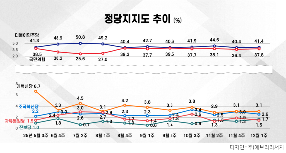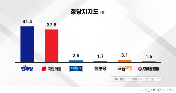 (ÁÖ)¿¡ºê¸®¸®¼Ä¡°¡ ½Ç½ÃÇÑ 11¿ù µÑ° ÁÖ Á¤±âÁ¶»ç °á°ú, ¡ã´õºÒ¾î¹ÎÁÖ´ç 41.4% ¡ã±¹¹ÎÀÇÈû 37.8% ¡ãÁ¶±¹Çõ½Å´ç 2.6% ¡ã°³Çõ½Å´ç 3.1% ¡ãÁøº¸´ç 1.7% ¡ãÀÚÀ¯ÅëÀÏ´ç 1.5% ¡ã±âŸÁ¤´ç 2.1%, ¾øÀ½ 9.1%, À߸𸧠0.7% Á¶»çµÆ´Ù.