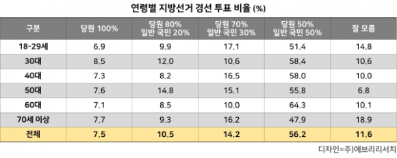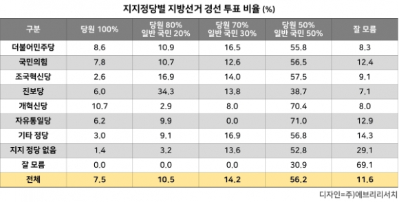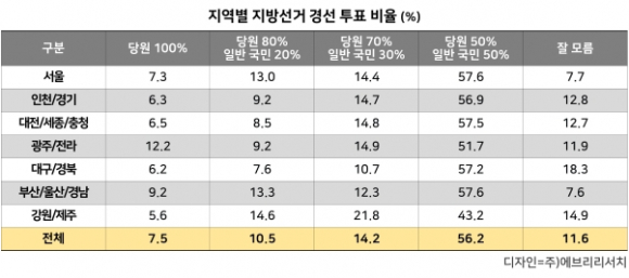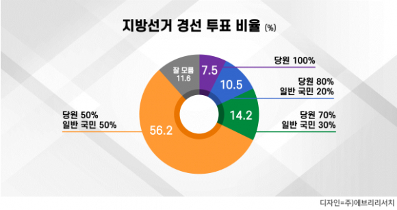 Áö¹æ¼±°Å °æ¼± ÅõÇ¥ ºñÀ²¿¡ ´ëÇÑ ¼±È£µµ Á¶»ç °á°ú, ±¹¹Î °ú¹ÝÀÌ ³Ñ´Â 56.2%°¡ ¡®´ç¿ø 50% + ÀÏ¹Ý ±¹¹Î 50%¡¯ ¹æ½ÄÀ» ¼±ÅÃÇß´Ù.