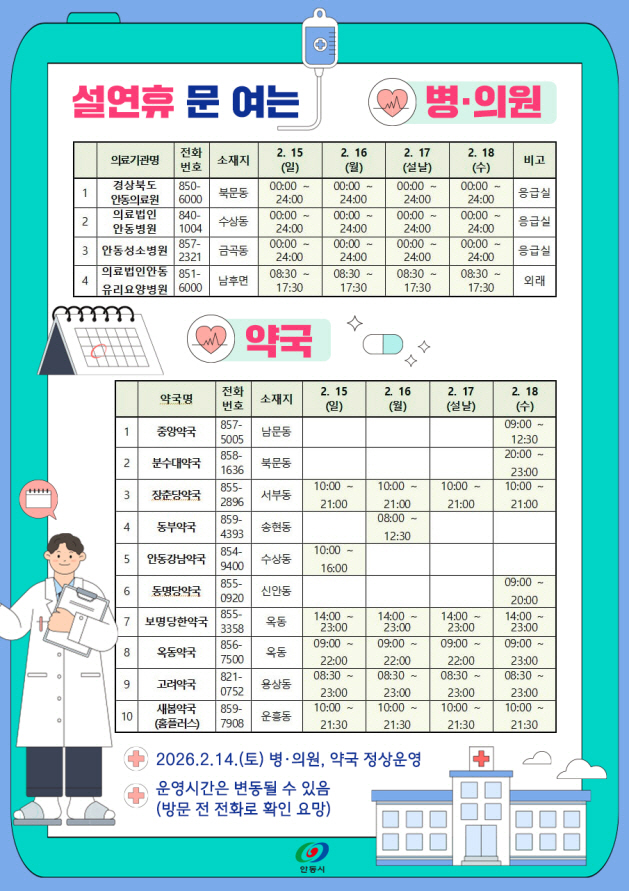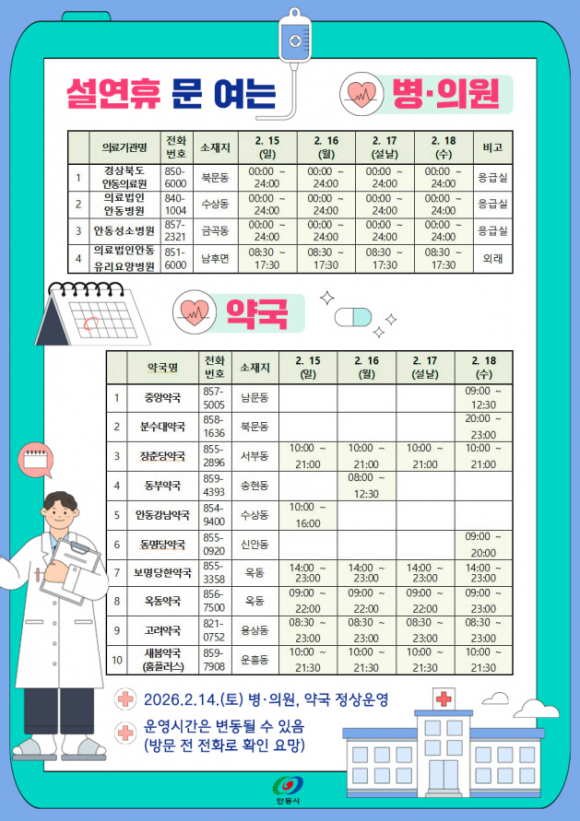 ¿¬ÈÞ ±â°£ ¹® ¿©´Â º´․ÀÇ¿øÀ̳ª ¾à±¹Àº ÀüÈ, ÀÎÅͳÝ, ½º¸¶Æ®Æù ¾ÛÀ» ÅëÇØ ½±°Ô ¾È³»¹ÞÀ» ¼ö ÀÖÀ¸¸ç, ¾Èµ¿½Ãû ¹× º¸°Ç¼Ò ´©¸®Áý, ÀÀ±ÞÀÇ·áÆ÷ÅÐ(www.e-gen.or.kr), ½º¸¶Æ®Æù ¾Û(ÀÀ±ÞÀÇ·áÁ¤º¸Á¦°ø)¿¡¼ È®ÀÎÇÒ ¼ö ÀÖ´Ù.