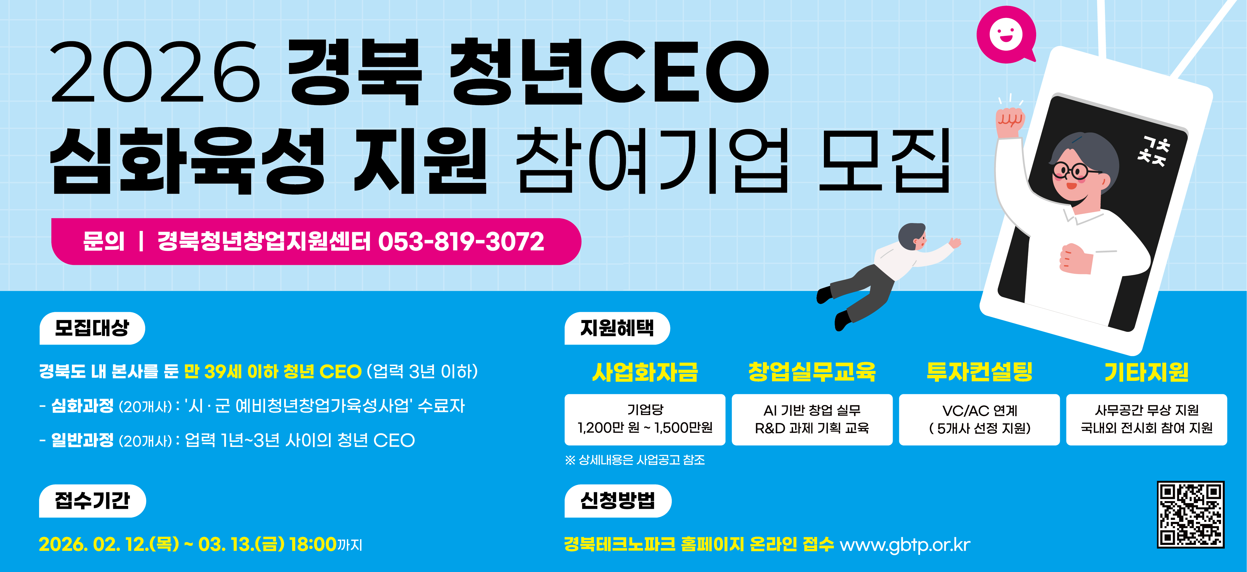 [°æºÏÆ÷Ä¿½º½Å¹®=ÀÌ»óÈñ±âÀÚ] °æ»óºÏµµ´Â â¾÷ Ãʱâ û³â±â¾÷ÀÇ ¾ÈÁ¤ÀûÀÎ Á¤Âø°ú ¼ºÀåÀ» Áö¿øÇϱâ À§ÇØ ¿À´Â 3¿ù 13ÀÏ(±Ý)±îÁö "2026 °æºÏ û³âCEO ½ÉÈÀ°¼º Áö¿ø»ç¾÷"Âü¿© ±â¾÷ 40°³»ç¸¦ ¸ðÁýÇÑ´Ù.