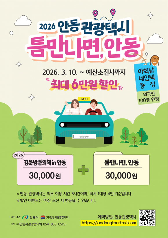 ¾Èµ¿ °ü±¤ÅýÃÀÇ ±âº»¿ä±ÝÀº 5½Ã°£ ±âÁØ 12¸¸ 5õ ¿ø(½ÂÇÕ 30¸¸ ¿ø)ÀÌ´Ù. °¢Á¾ ÇÒÀÎ À̺¥Æ®¿Í ¿¹¾à ¾È³», Ãßõ °ü±¤ÄÚ½º µî »ó¼¼ÇÑ ³»¿ëÀº ¾Èµ¿ °ü±¤Åýà ´©¸®Áý(https://andongtourtaxi.com) ¶Ç´Â (»ç)¾Èµ¿½Ã°ü±¤ÇùÀÇȸ(¢Ï 054-855-0515)¸¦ ÅëÇØ È®ÀÎÇÒ ¼ö ÀÖ´Ù.